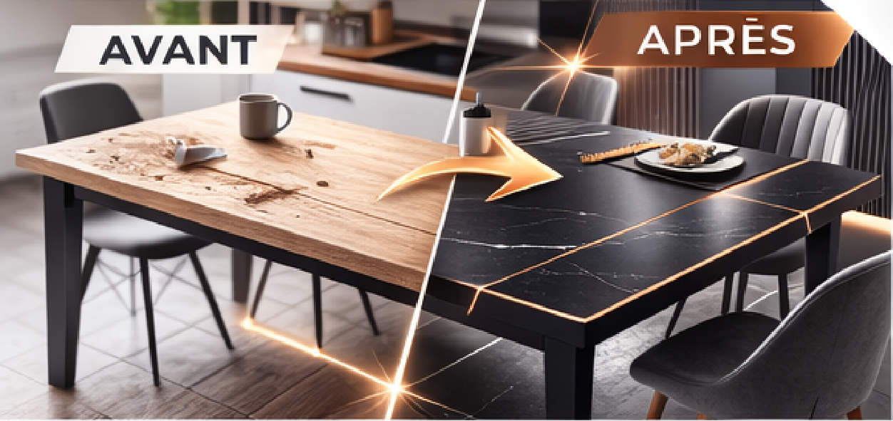 Que ce soit pour votre bureau à domicile ou vos tables de salle à manger, le covering offre une solution esthétique et résistante pour une surface comme neuve.